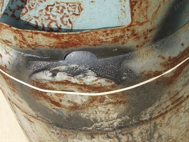 This picture shows a dented 33 lb. forklift cylinder. This external container damage is the result of improper storage. This cylinder was placed on a warehouse ramp and was hit by a fork from a forklift. Had the cylinder been stored in its protective cylinder cabinet, it would have been properly safeguarded. Improper propane cylinder storage can lead to damage such as this. This forklift cylinder was removed from service because of the damage. See Propane Cylinder Storage for more information on protecting cylinders from damage.