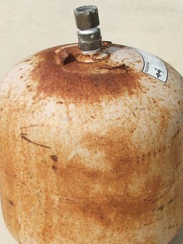 A top down view of the same forklift cylinder that should have been properly stored. Again, notice the dent depth of the damaged cylinder. This forklift cylinder was removed from service. See propane cylinder storage for more information on protecting propane bottles and cylinders when not in use.